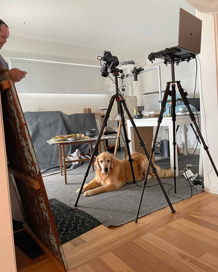 And a look-back on Dozer’s past 11 years would not be complete without snippets of his life on the job! Squeezing himself under tables laden with food I’m photographing……particularly alarming given his size. If he lifted his head, those meatballs would go flying!!