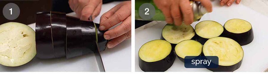 - Cut the eggplant into 2cm / 0.8” rounds.
