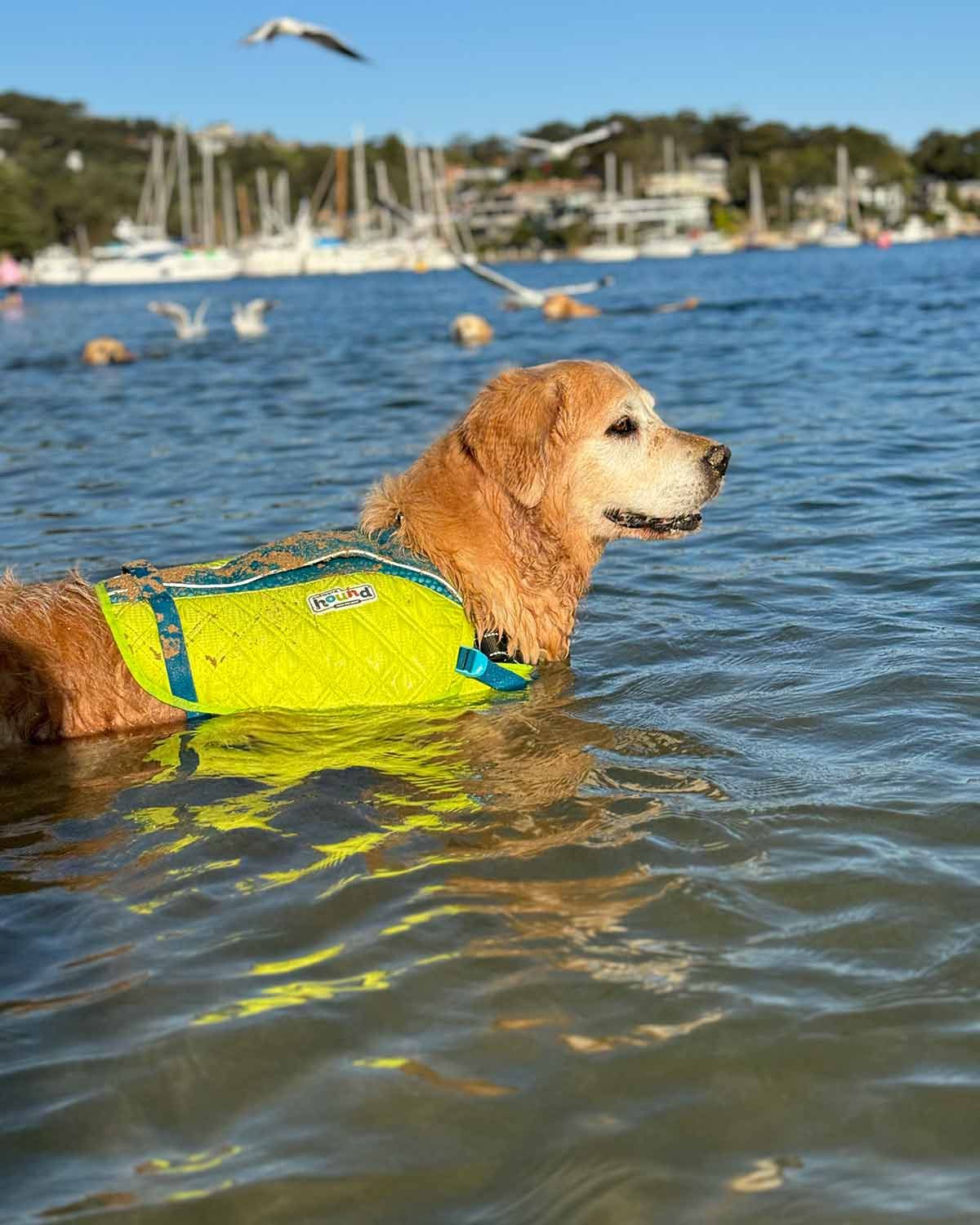 And today, we have Dozer Maehashi modelling a vibrant green High Performance Life Jacket. This is designed for experienced swimmers to provide a wide range of motion and comes equipped with double handles to restrain your dog from lunging at an ice cream cone held by a 5 year old child.