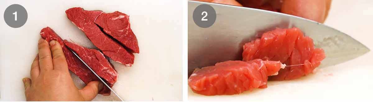 Cut the beef into 1.5cm / 0.6″ strips