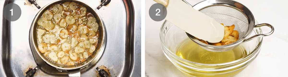 - Put the garlic and oil in a tiny saucepan on low heat. Simmer for 5 minutes, stirring a few times, until the garlic is light golden. Cool for 15 minutes then strain (reserve crispy garlic for another use)