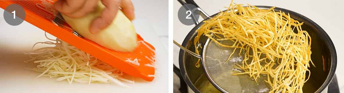 Julienne potato – Use a julienne mandolin to cut the potato. it extra crisp)