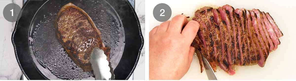 Cook steak – Cook the steak to your liking in a screaming hot cast iron pan. Restaurants typically cook it to rare (sometimes raw!) but you can cook it to your liking. (Note: The more well done the steak is, the harder it is to cut into fine slices as the meat is more prone to breaking). See the cooked temperature of steak in the recipe notes.