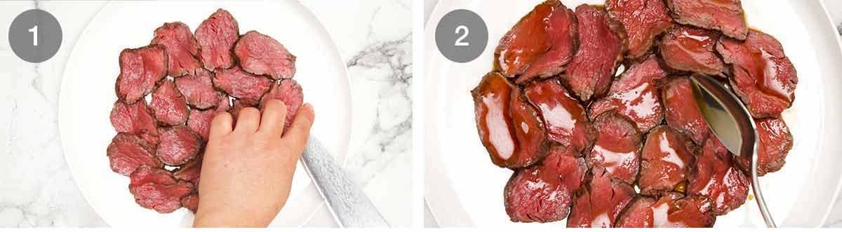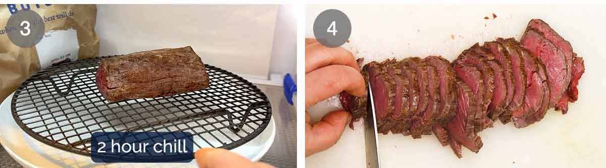 Cool – Transfer the beef to a rack set over a tray. Cool on the counter for 30 minutes then refrigerate, uncovered, for 2 hours (up to 8 hours). Cold beef = easier to slice thinly.