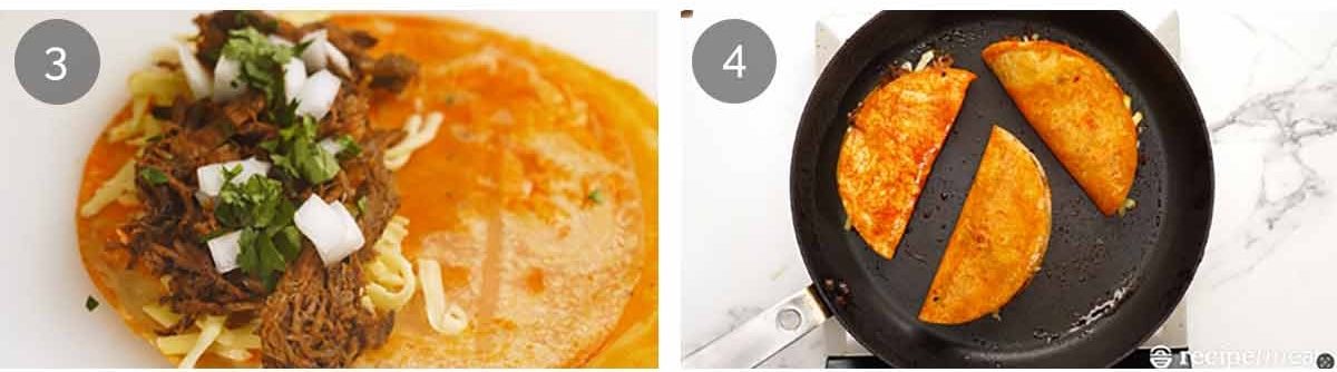 - Simmer chopped chillies 10 min. Strain, blitz Adobo paste. Brown beef, cook off adobo paste, slow-cook beef 2 1/2 hrs (lid on). Remove meat, shred, skim fat off braising liquid ("Birria Oil"). Toss beef in skillet with 1 cup braising liquid (aka Consomme). Heat 1 tsp Birria oil over low heat, wipe pan with tortilla, remove, repeat x2 with 1/2 tsp oil each. Top tortilla with cheese, beef, onion, coriander, fold over, pan fry until crisp. Serve with Birria Consomme for dunking!