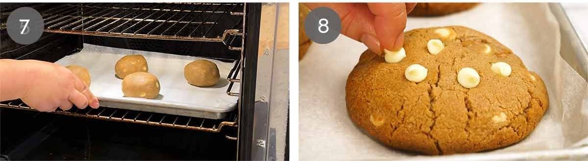 Cool ON tray – As soon as you take the cookies out of the oven, press extra chocolate chips onto the surface. I do some flat and push some in slightly on an angle. The chocolate will melt so they adhere to the cookie.