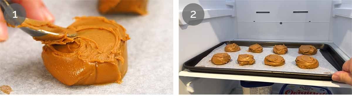 Dollop Biscoff spread onto a lined tray, then flatten the surface to make it a thick disc shape which makes it distribute more evenly inside the cookie as it bakes. If you leave it as a heaped mound, you end up with a pool of Biscoff concentrated in the middle of the cookie.