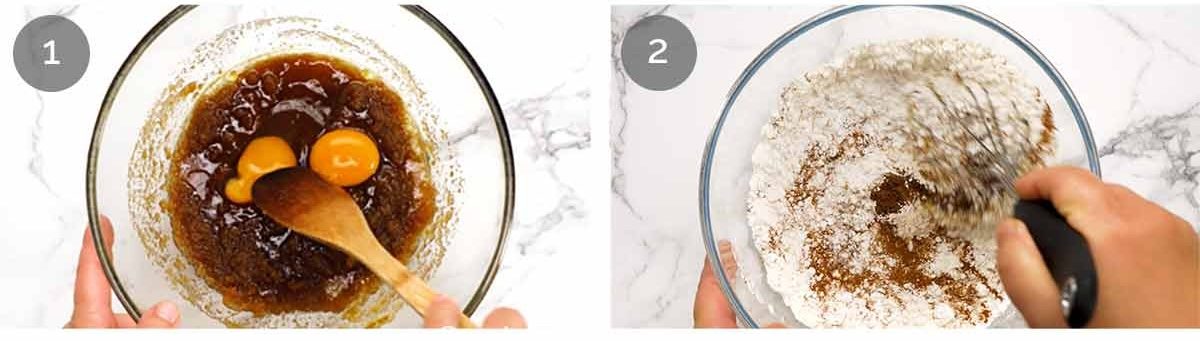 - Mix Wet – To the browned butter, add both sugars and mix with a wooden spoon. Add the egg, yolk and vanilla. Mix until smooth – it will look like caramel.