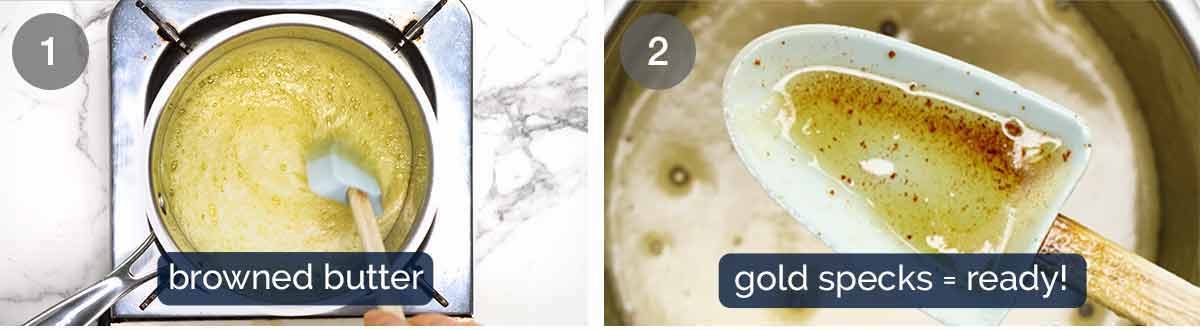 - Browned butter (don't skip this step): Place the butter in a silver saucepan (not black) over medium high heat. Once melted, lower the heat to medium so it's simmer gently. Simmer for 3 to 4 minutes, stirring every now and then (it will go foamy), until it smells nutty and you see little golden specks in the butter. Immediately pour the butter and all the golden bits into a bowl.