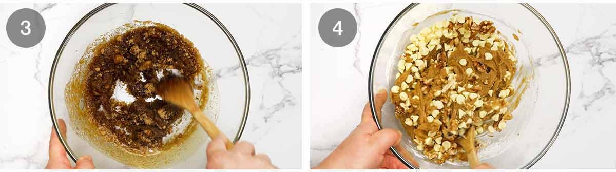 Finish batter – Add the egg and vanilla, then mix. Add the flour and salt, then mix again. Add the chocolate chips and walnuts (or whatever add-ins you are using) and mix through. It will be quite a thick mixture, almost like roll-able cookie dough.