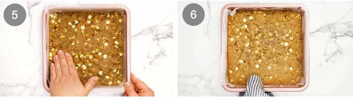 Bake – Scrape and press the mixture in a 20cm/8″ baking paper lined pan (parchment paper). Make sure there’s plenty of paper overhang so you can lift it out rather than flipping it upside down.