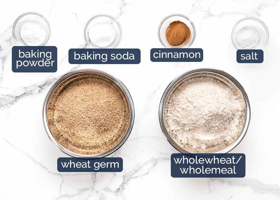 Wheat germ (sub wheat bran) – The good-for-you extra fibre boost! Found in either the cereal aisle, health food section or flour aisle or grocery stores. While both wheat germ and wheat bran work, I think wheat germ is nicer. It has lovely nutty flavour because it’s the seed inside wheat kernels. Whereas wheat germ is the exterior of wheat kernels so it gives the muffins a slightly earthier flavour. Both have similar nutrition characteristics – high in dietary fibre as well as other nutrients. Better for you than plain flour!