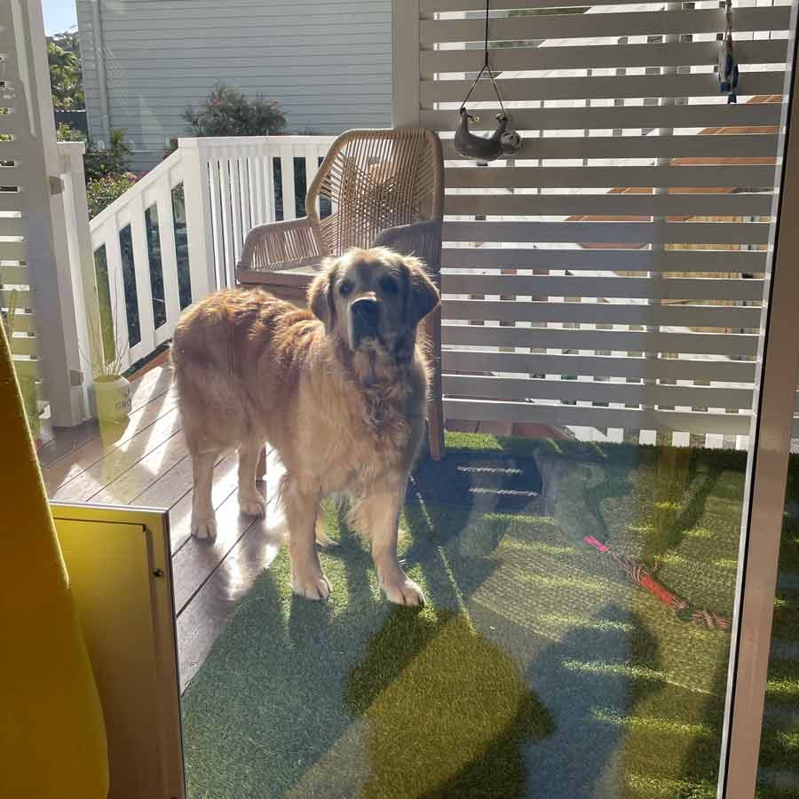 He was banished outside until I could wash him because he rolled in duck poo while out on a walk. Hard to resist that forlorn face. He’s used to total freedom – coming and going as he pleases! (Confession – one pitiful wail and I ditched work to go outside to bathe him. #sucker)