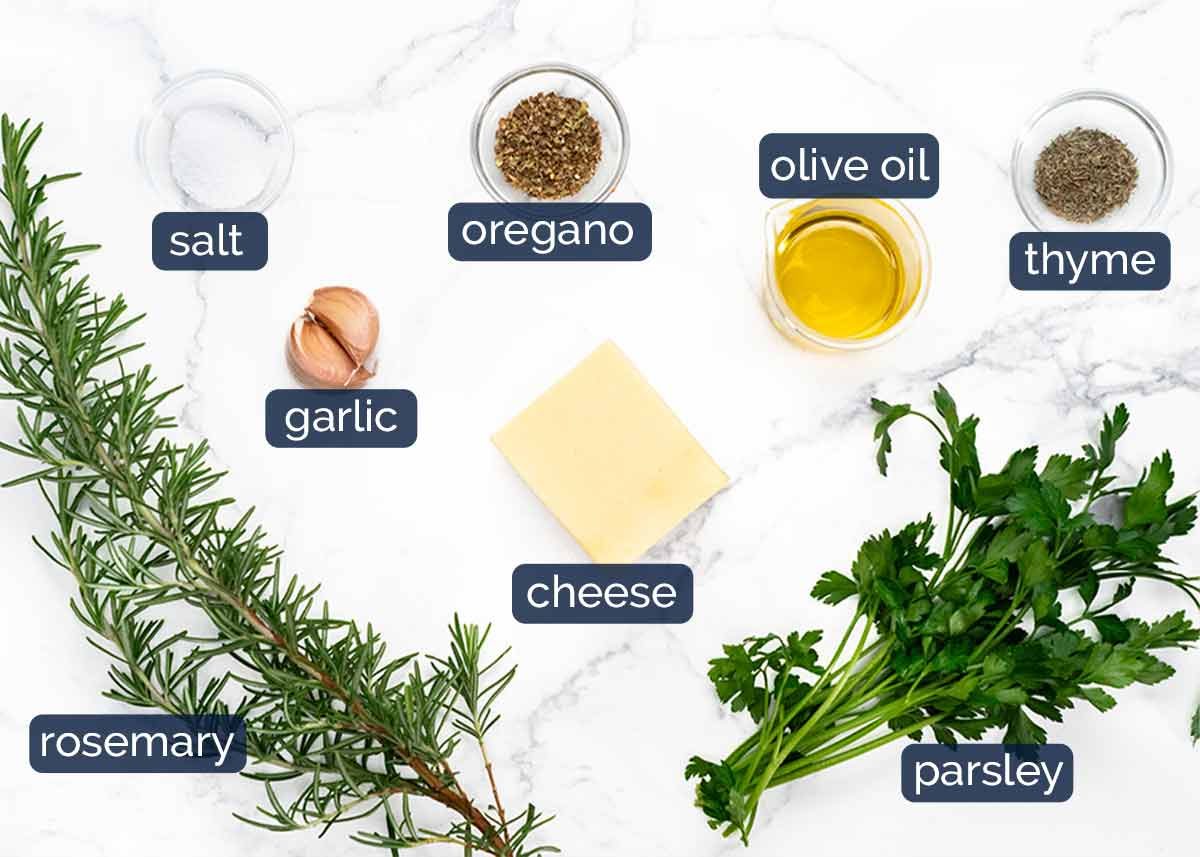 Herb garlic mixture – Just put everything into a bowl and mix together. It should be dollop-able, so if it’s a little on the dry side just add a smidge more oil.