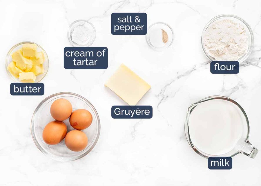 - Melt butter, cook flour 2 minutes, whisk in warm milk in 3 batches. Add salt and pepper, turn off heat, whisk in yolks one at a time, then melt through gruyere over low heat. Beat egg whites and cream of tartar to firm peaks, starting on medium for 2 minutes, then increasing to high. Whisk 1/4 of the whites into Mornay Sauce, then fold through remainder in 3 batches. Fill butter brushed ramekins to 1cm/0.4” from rim, clean inside of rim. Bake at 200°C/400°F (180°C fan) for 20 minutes. No peeking! Serve immediately.