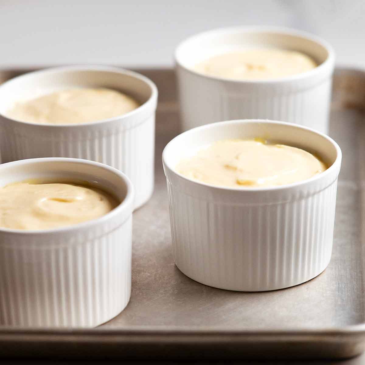 - Prepare the ramekins (Note 4) – Brush the insides of 4 (325ml / 1 1/3 cups) ramekins generously with melted butter (use all the butter). No need to brush upwards (see post for why). Set on a baking tray.