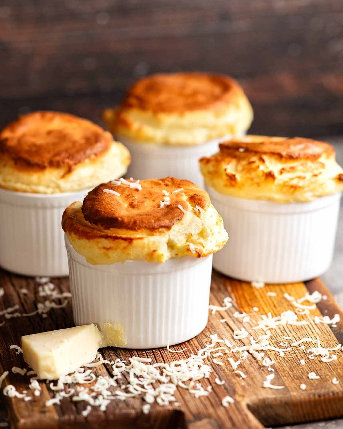 Soufflés have a bit of a “scary” reputation, but honestly, they’re easier than you think. It’s just a fancy name for a cheese sauce puffed up with egg whites after all. Once you know how to do that, you’re set. The oven does the rest!