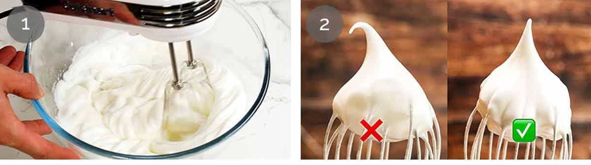 Beat the egg whites – Put the egg whites and cream of tartar in a large bowl. Using a hand mixer or a stand mixer fitted with the whisk attachment, start beating on medium speed for about 2 minutes until soft peaks form.