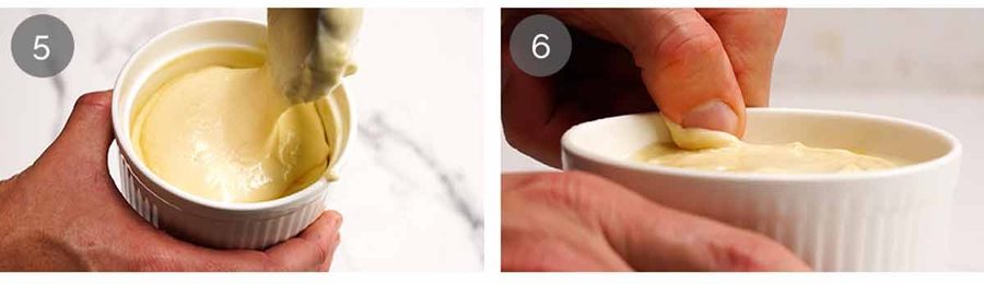 - Fill the ramekins – Pour the mixture evenly into the ramekins using a ladle or a large serving spoon, filling to about 1cm / 0.4" below the rim. Smooth the tops with the back of a teaspoon dipped in water, no need to be 100% meticulous here, just get rid of big bumps. Run your thumb around the inside rim of each ramekin to clean it, this gives the soufflé a clean edge to rise against.