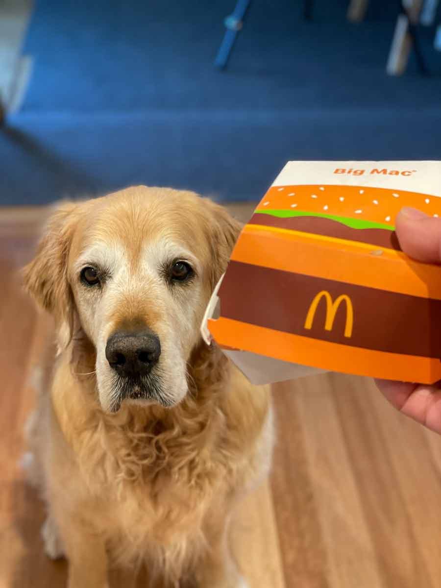 And here he is, looking mighty unimpressed at the sad McDonald’s Big Mac I got for study purposes to compare Maccas’ special sauce to my recipe. (Spoiler: no comparison!!!)