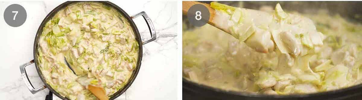 - Sear surface of chicken in half butter, remove. Cook bacon 1 minute, then leek, celery and garlic 5 minutes. Deglaze with wine, melt remaining butter, then cook flour 1 minute. Add stock, then remaining Filling ingredients. Add chicken, thicken sauce (~5 minutes).