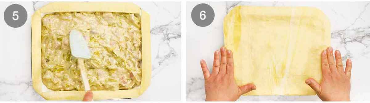 Connect puff pastry – If needed. Standard frozen puff pastry in Australia are 20cm / 8″ squares which is a little short for most casserole pans and pie dishes suitable for baking chicken and leek pie in.