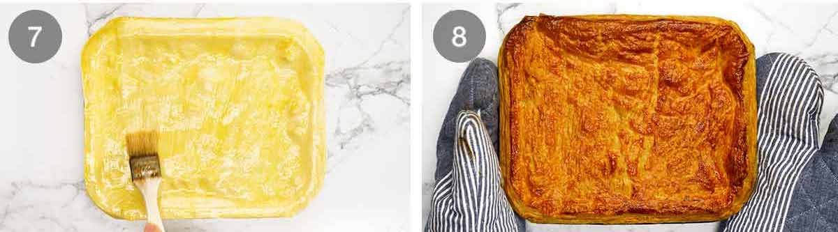 Note: If you are not using pastry strips along the rim, don’t brush the rim with egg whites as the lid will adhere too strongly to the baking dish.