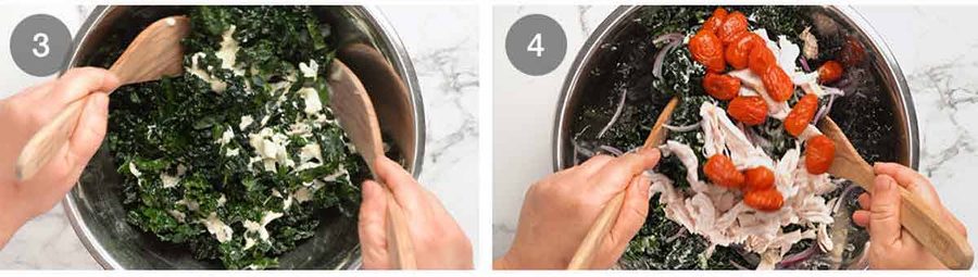 - Toss – Pour half the dressing over the kale and toss. Add onion, chicken and most of the tomatoes (save a few for decoration). Toss again.