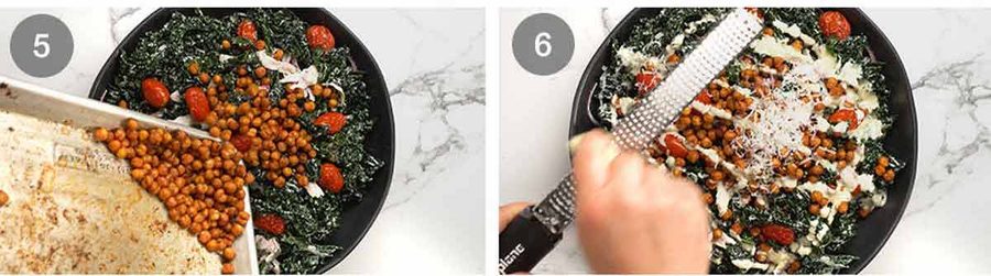 - Soften kale – Rub/scrunch the kale with the oil, salt and pepper in a large bowl. Put the kale in a large bowl then drizzle with the oil and add the salt and pepper. Set aside for 20 minutes (softens leaves).