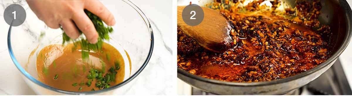 - Sizzling chili crisp – Heat chilli crisp and oil in a small pan over medium heat. Add ginger and garlic, stir 30 seconds until golden and it smells amazing. Pour over green onion – enjoy the sizzle! Then mix.