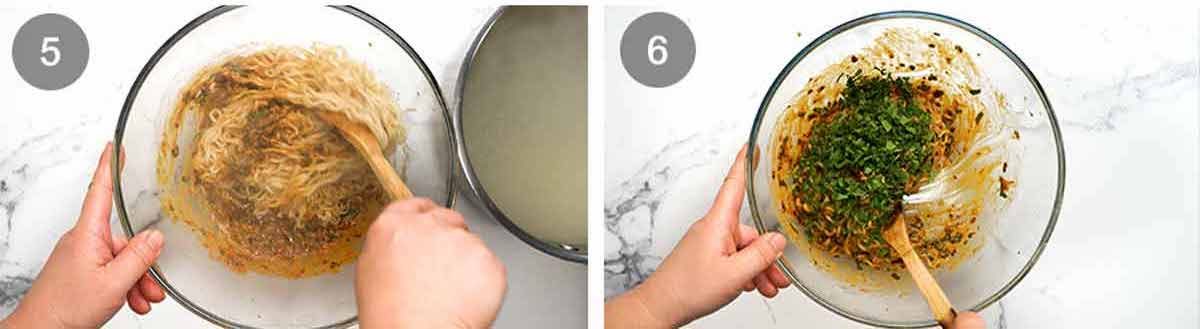 - Toss – Cook noodles per packet directions. Drag the noodles straight from the saucepan into the bowl (extra water loosens the sauce). Toss. Use cooking water to loosen more if needed. Toss through coriander/cilantro.