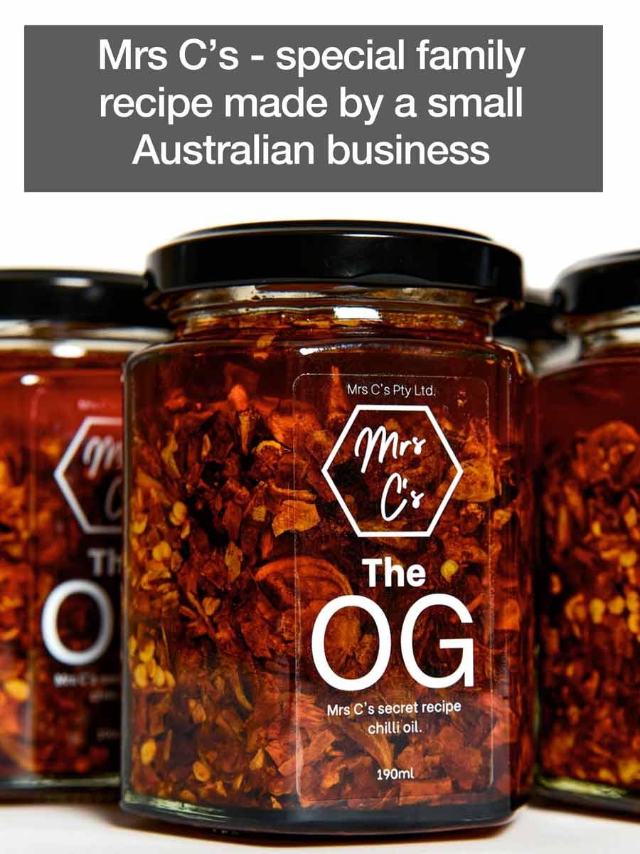 Which one I use – My go-to is Laoganma’s Spicy Chilli Oil (above) which is a worldwide favourite. But I am currently obsessed with Mrs C’s Chilli Crisp which I discovered at the Melbourne Good Food & Wine Show last month. A secret recipe passed down through generations, this chilli crisp made by a small family run Australian business is exceptional in flavour and crunch. Treat yourself when you’ve been good, support a small Aussie business or gift it to chilli loving friends! This stuff is special. Get the APPRENTICE if you want all the flavour without too much spiciness (this is what I get), or the OG (classic) if you can (I use this very sparingly, it’s quite spicy!). The OG is spicier than Laoganma, the Apprentice is about the same (maybe a touch less spicy).