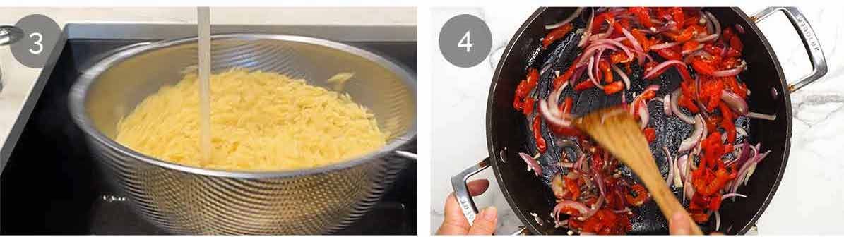 Drain and rinse – Drain the risoni then give it a quick rinse under cold tap water to rinse off excess starch. If you skip this step, the sauce can get a little too “gluey” from excess starch, and also prevents the risoni from sticking together as it’s sitting in the colander waiting to be used.