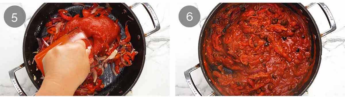 - Simmer – Add tomato and olives. Bring to a simmer, lower heat to medium and simmer for 5 minutes, stirring every now and then.