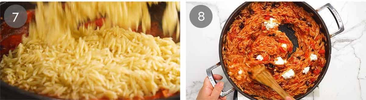 - Melt goat cheese – Add cooked risoni, salt, pepper and the pasta cooking water. Stir to combine. Add most of the goat's cheese (reserve some for garnish), stir so it melts.