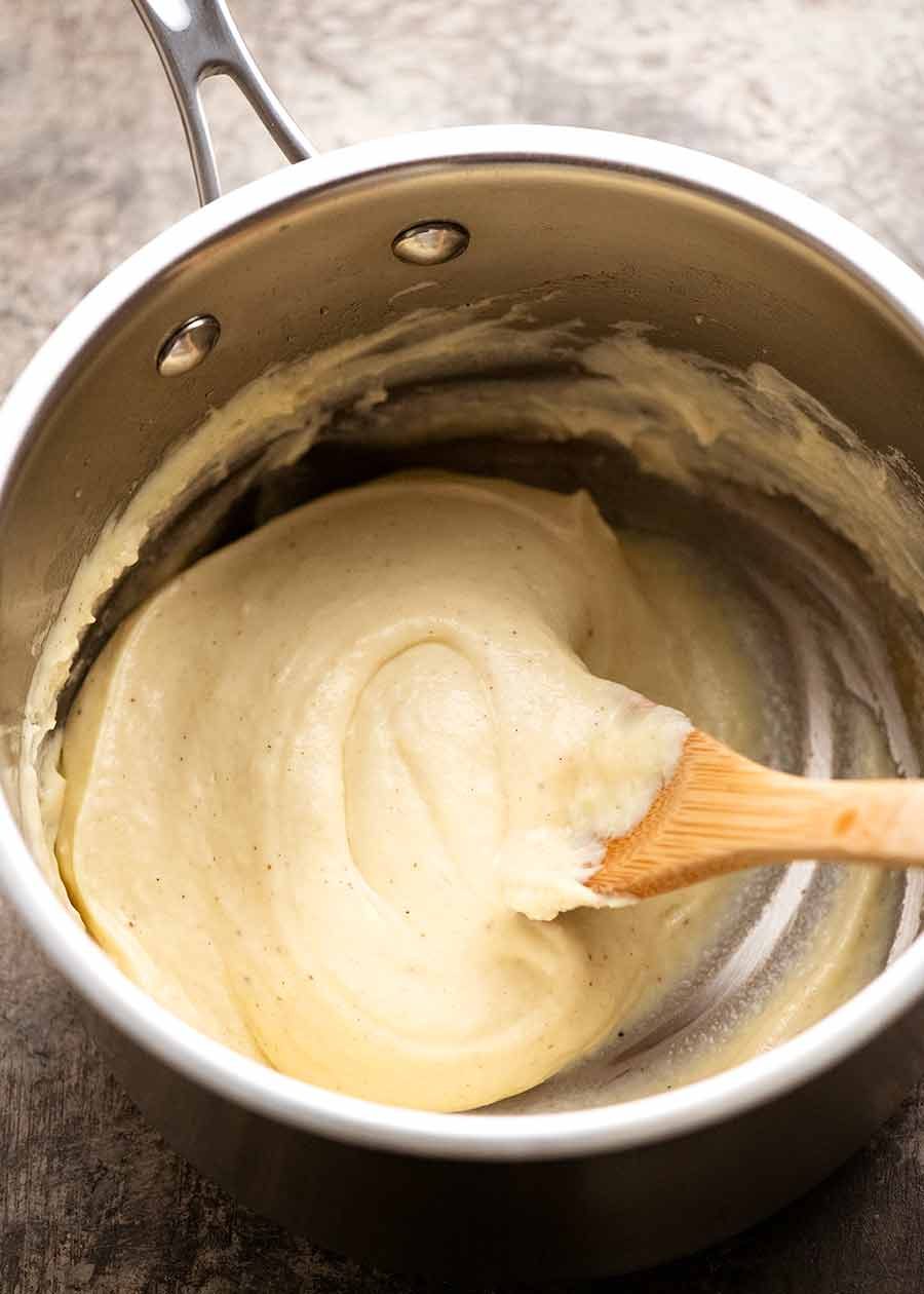 Thicken – Cook, stirring constantly, until the mixture is so thick that you can spread it like peanut butter on bread. This will only take a minute or so because the ratio of flour to milk in this Béchamel is higher than normal so it’s spreadable rather than pourable.