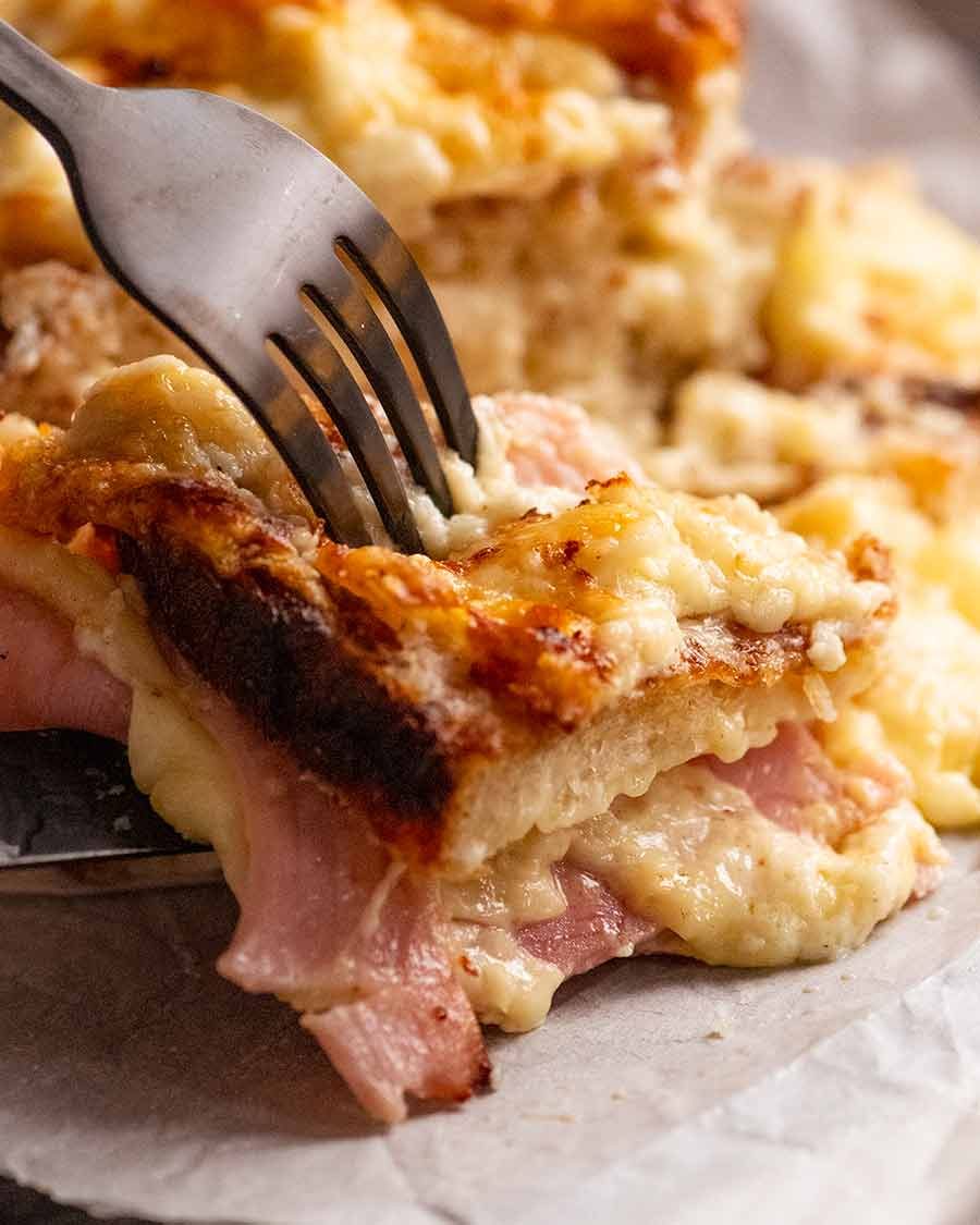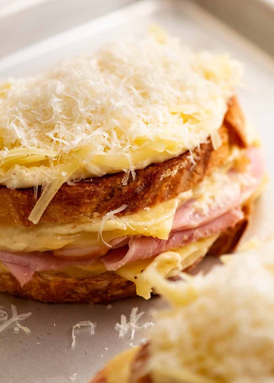 Parmesan – Alpine cheeses are relatively mild, so parmesan boosts the savoury oomph and saltiness to just where we want it, as well as giving the top of the Croque Monsieur a gorgeous crusty golden crown;