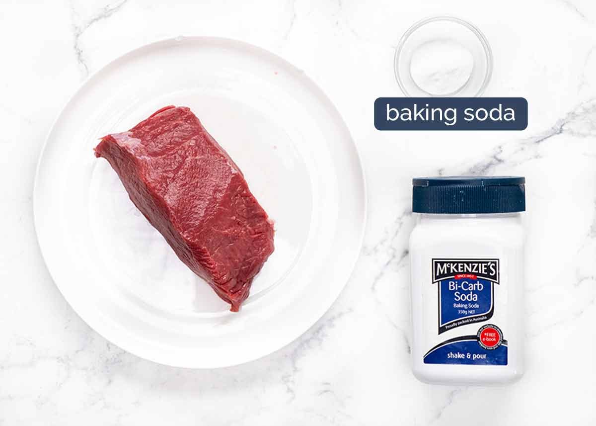 - Velvet beef – Place the beef in a bowl. Sprinkle the baking soda over then use your fingers to toss the beef to coat as evenly as possible. Set aside for 20 minutes (no longer).