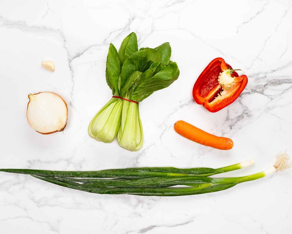 - Vegetables #1 – Add the capsicum, carrots, bok choy stems and white part of the green onions. Stir fry for 1 minute