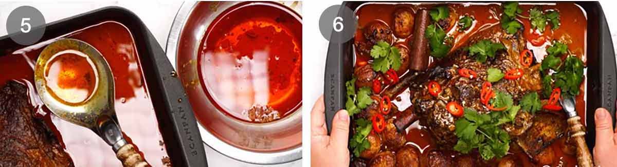 - Serve – Rest for 10 – 15 minutes. Spoon off as much or as little excess fat off surface, discard. Mix sauce well (it's quite runny, if it was thicker it'd be too rich). Transfer to a serving dish, if you like, sprinkle with chilli and coriander. Serve! (Note 7 for serving styles)
