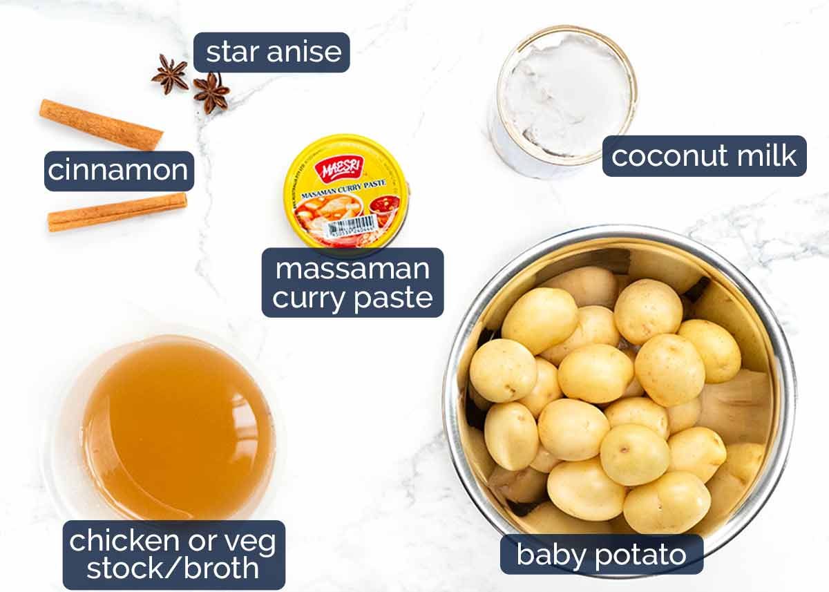 Potato and onion – traditionally included in traditional Massaman Curry. Use whole baby potatoes, around 3cm/1.2″ wide is ideal, so they hold together and become beautifully soft and creamy inside. ⚠️ Do not use cubes of cut potato as they will disintegrate and make the sauce grainy!