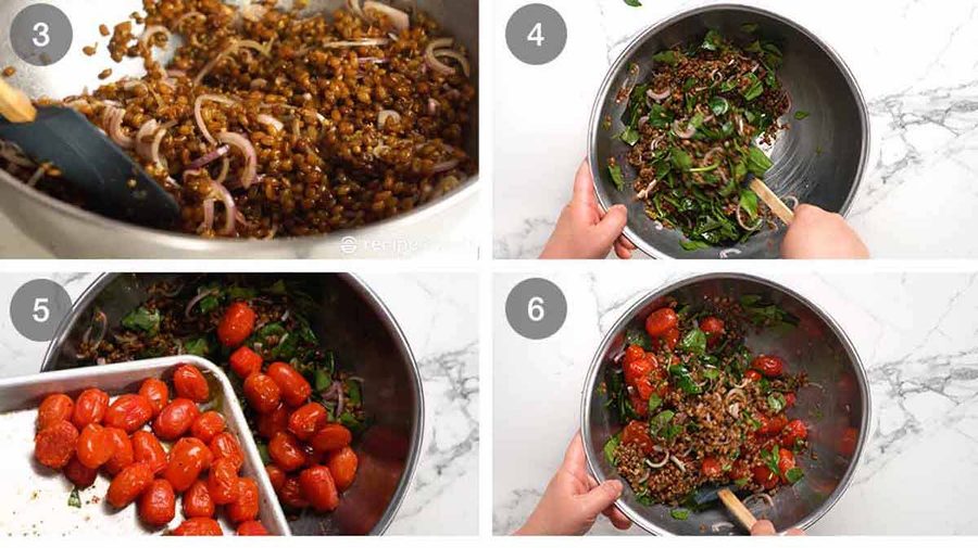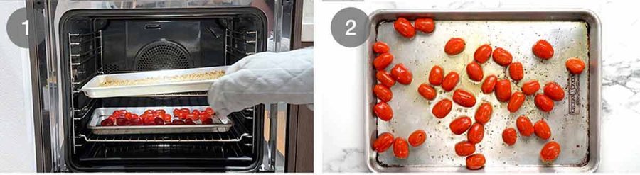 - Roast tomatoes and toast farro – Toss tomatoes on a tray with the olive oil, salt and pepper. Spread farro on a separate tray. Put both in the oven, farro on the top shelf, tomatoes underneath. Bake for 8 minutes, shaking the trays halfway. The farro should be browned with a nutty flavour, the tomatoes should be a bit wrinkly but still holding their shape.