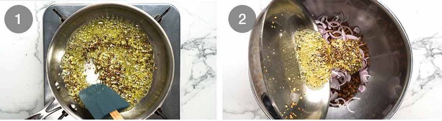 Immediately pour the sizzling oil over the eschallots on the farro. The hot oil will partially cook the eschallots and make them wilt a bit.