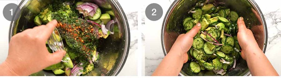 Chuck everything into a bowl – avocado, cucumber and red onion first, top with herbs, then drizzle/sprinkle all the dressing ingredients over. No need to make the dressing separately for this recipe!