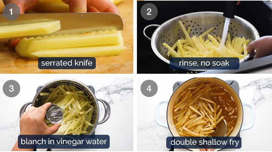 - Simmer: Place fries in a large pot with 2 litres/quarts of cold tap water, vinegar and salt. Bring to a boil over high heat then immediately reduce stove to low so the surface is rippling gently (Note 5), not big bubbles. Cook for 10 minutes then carefully remove using a slotted spoon into a colander (do not tip into colander, fries will break).