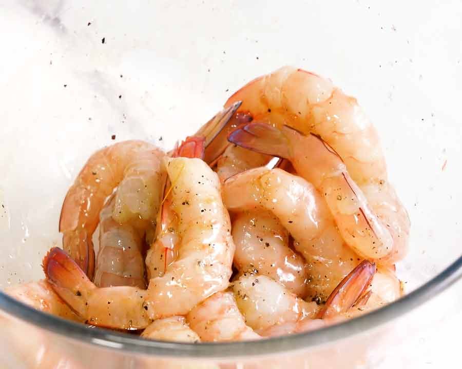- Marinade: Place the prawns, 1 tablespoon olive oil and pepper in bowl. Gently toss then set aside for 20 minutes (no longer else the prawns will sweat from the salt),.