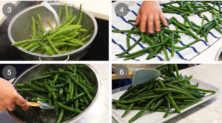 - Season โ Spread beans on a tea towel then dry with a 2nd tea towel. Transfer into bowl, toss with the oil, salt and pepper.