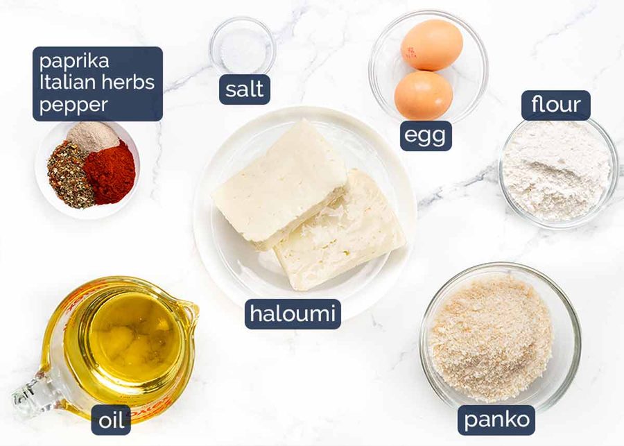 - Prep โ Using 3 bowls large enough to toss the halloumi, put the eggs in one bowl, mix Flour Dredge in another and mix Crumbing ingredients in a third.