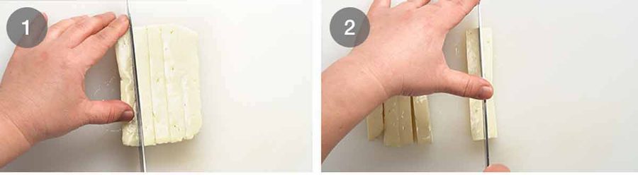 Cutย the haloumi into sticks around 1.5cm / 0/6โณ thick. The length will depend on the shape of your haloumi. I cut mine into 5 slices lengthwise, then each into half which makes uniform fries, and get 20 pieces.