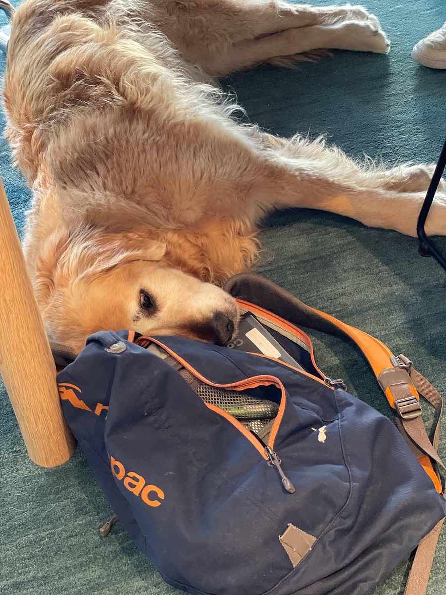 Passed out from exhaustion after snuffling around unsuccessfully in someone’s backpack for treats. (Or….perhaps not unsuccessful!)
